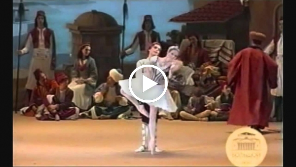 Anastasia Goryacheva and Denis Medvedev dances Pas d'esclaves in great reconstruction of classical ballet Le Corsaire by Bolshoi Ballet,broadcast from 2007 (2nd premiere),choreography by Marius Petipa,reconstructed and new choreography by YuriBurlaka and Alexei Ratmansky,music by Adolphde Adam,Riccardo Drigo,Ludwig Minkus and others.